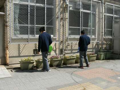 1組は生活の時間で、花や野菜に水やりです。暑い中、ごくろうさま。