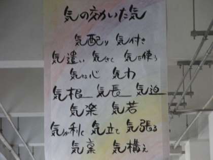 今朝、1年生の廊下に「気の効いた気」というメッセージが掲げられていました。