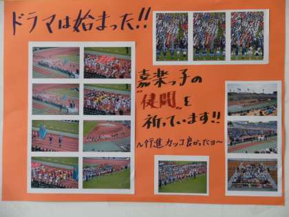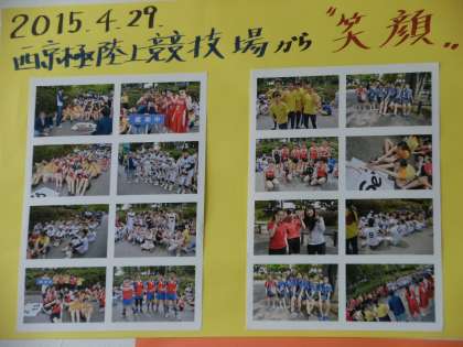 階段の掲示板に、先日の春体開会式の写真が貼られていました。みんな笑顔で楽しそうな写真ばかりです。