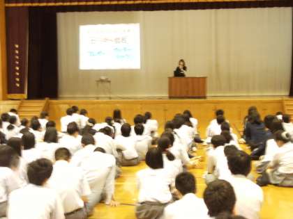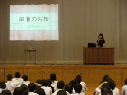 次は、家庭科の先生から服育のお話がありました。相手に与える第一印象は、その後の人間関係に大きな影響を及ぼすことや制服の持っている力などいろいろな話を聞かせてもらいました。話を聞き終わったあと、みんながちょっとでも自分の服装、身だしなみを意識できるようになってくれればと思います。