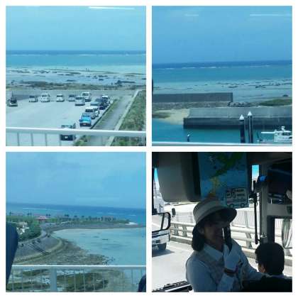 車窓から沖縄らしい風景を楽しみながら、ガイドさんのお話を聞いています。