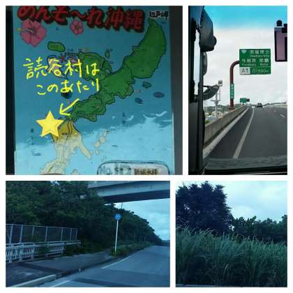 読谷村は、地図(写真左上)の中では星マークのところ辺りです。窓からはさとうきび畑や、屋根の上に貯水タンクのある家などが見えます。北部に山があっても、川からすぐに海に流れたりで、降水量が少ないわけではないのにタンクがあるそうです。上空には時折戦闘機もとんでいます。