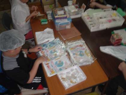 写真は、手芸をして、袋詰めしているところです。