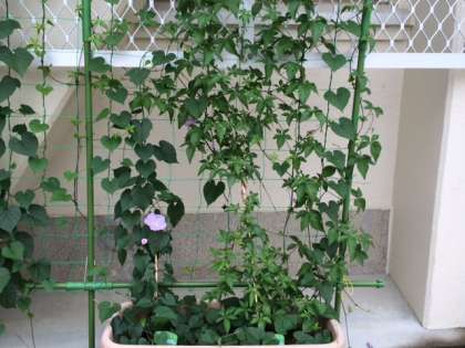 梅雨の谷間の一涼,グリーンカーテンの琉球朝顔が咲き始めました。