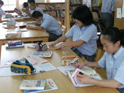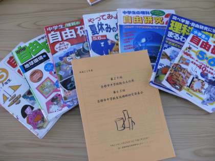 本日1限目2年生理科で「自然研究のテーマを見つけよう!」という授業を図書室で行いました。この授業をするために、京都市中央図書館のご協力で、自然研究に関する本を学級の生徒分約30冊、お借りすることができました。生徒のみんなは自然研究に関する本をかわるがわる手にとって、「おもしろうそう!やってみたい!」「これと同じような実験を去年やった!」「この観察どうやったらええのかな」など興味を持って調べていました。おもしろい自然研究のテーマが見つかるといいですね!