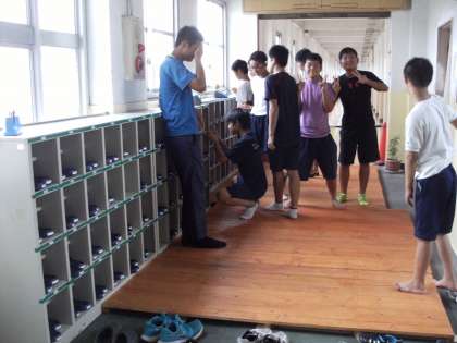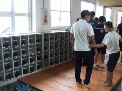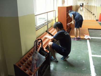 陸上部員やラグビー部員が、下駄箱や傘立てのシール貼りを手伝ってくれました。