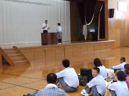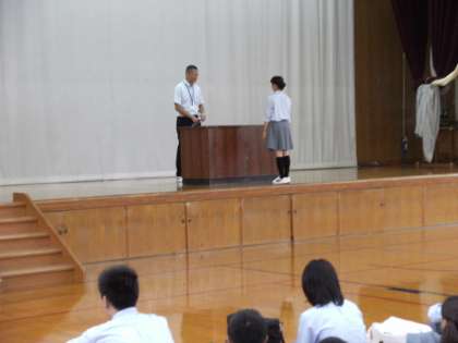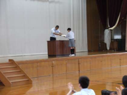 集会の最初に表彰を行いました。この夏休み、2年生の女子1名が、新体操で市・府・近畿大会で入賞を果たし、北海道で行われた全国大会(全日中)に出場をしてくれました。
