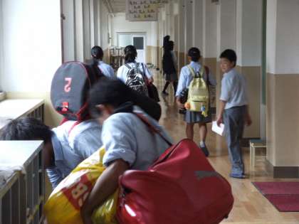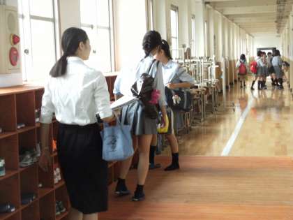 2期がはじまり10日ほど経ちましたが、3足制にも慣れてきたようです。登校してきた生徒は上履きのスリッパに履き替えて教室へ向かいます。