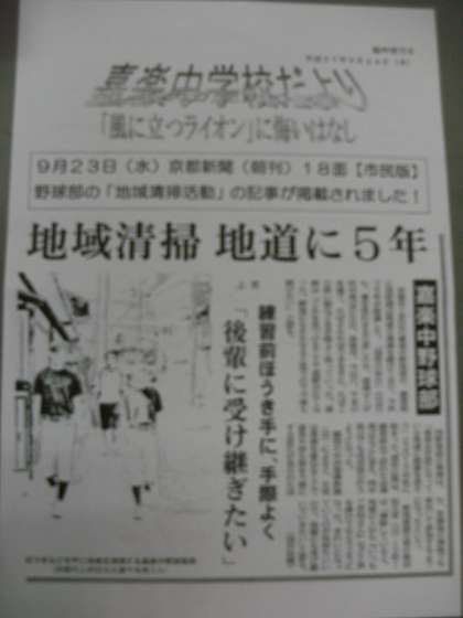 9月23日(水)京都新聞(朝刊)に野球部の「地域清掃活動」の記事が掲載されました。普段から練習前の母校周辺地域の清掃を続けており、その活動を記事にしていただきました。「普段お世話になっている地域に感謝を表そう!」という気持ちで始めたこの活動をこれからも続けていけたらと思います。