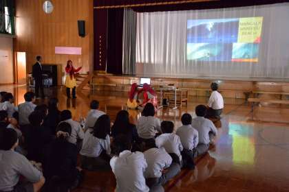 6限は体育館で、2組は嘉楽中学校での学校生活の様子を紹介し、4組は学校の周辺にある船岡山や船岡温泉など、有名な名勝について、日本語と英語を交えて紹介しました。