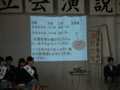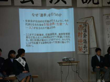 立候補者の演説が全て終了したところで、選挙管理委員から選挙の意味、大切さ、そして投票の仕方などがスクリーンを使いながら丁寧に説明がありました。