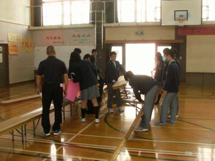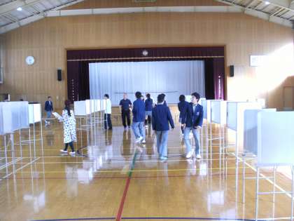 立会演説会が終了後、生徒のみんなは一旦教室へ戻ります。その間に、選挙管理委員会のみんなが会場作りをしてくれました。