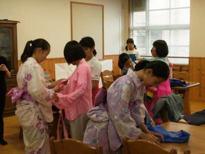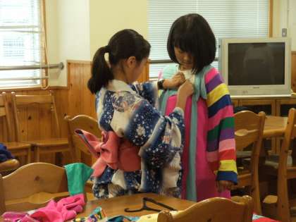 朝鮮と日本の服育グループです。チマチョゴリと浴衣をそれぞれ着て、全体会ではファッションショーを行う予定です。