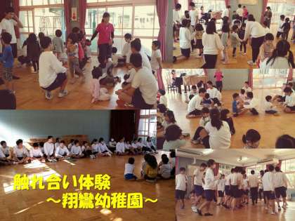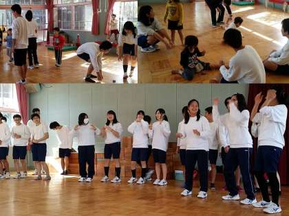 最初は遊戯室に集合。園長先生のお話を聞いた後,幼稚園の先生の司会で,「おたんじょうび月仲間」「あたまであくしゅ」というなかよし遊びでスタートです。緊張気味だった子ども達(中学生も園児も)みんなだんだんほぐれていく様子が,見ていてかわいらしかったです。