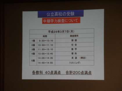 本日午後7時より、本校いきいき交流ルームにおいて、第3回進路保護者説明会を行いました。学校長のあいさつのあと、本校の進路指導主事より、進路に向けての話をさしていただきました。今回は公立高校の受検を中心に、今後の日程や願書の書き方、私学入試との関係等、説明させていただきました。また、何かありましたら、担任を通じてご質問していただければと思います。