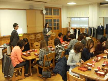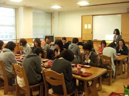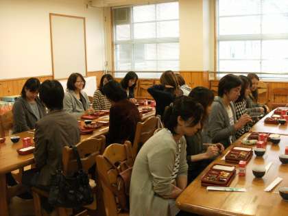 皆さんでテーブルを並べ直して配膳していただき、手際良く準備をしていただきました。そして主事の方から本日の献立の説明をしていただき、皆さんで「いただきます!」をしました。今日は和食中心の献立です。お味のほうはどうでしょう?皆さんで楽しくおしゃべりしながら和やかな雰囲気での試食会でした。