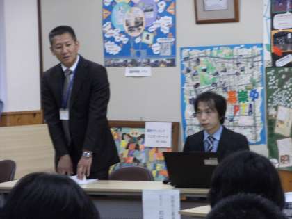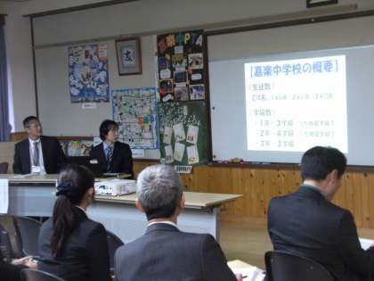 まず最初に、学校長よりあいさつとして、本校の様子やこれまでの取組の経過を説明させていただきました。続いて、本校研究主任よりテーマ設定の理由、これまでの取組や今後の課題等、報告させていただきました。