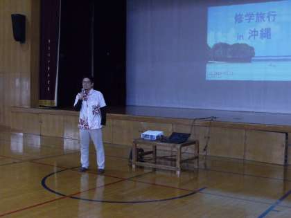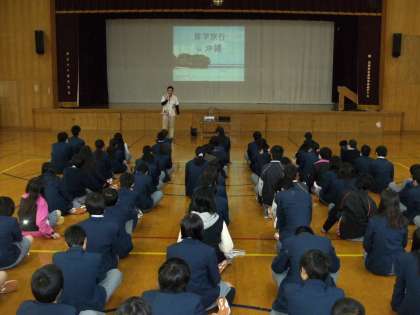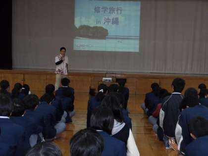 本日4限、2年生は体育館にて、修学旅行事前学習をおこないました。