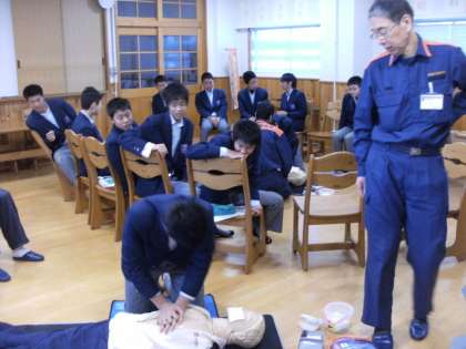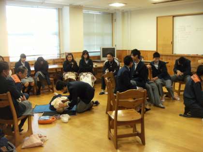 最初に説明を受け、続いて順番に心肺蘇生法、AEDを使った実習を行いました。みんな真剣に、そして本当に楽しく授業をすることができました。昨日は3組、今日は2組、明日は4組の予定で行います。