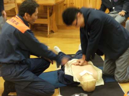 これは3時間の設定で、上京消防署の方を講師にお招きし、前回は11月に1時間「救命救急講習」ということでテキストにそって心肺蘇生法やAEDの使用方法等を学び、今回は2時間の設定で実習を行うというものです。