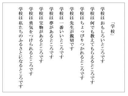 この詩(文)には,様々な背景や環境で育ってきた生徒の皆さんの,「学校」に対する純粋な思い,希望,願いがたくさん含まれているように思います。私は,改めて「学校」が本来目指すものを,この詩から強く感じました。