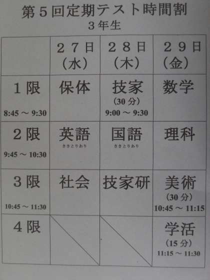3年生は来週1月27日(水)〜29日(金)の日程で、第5回定期テストが実施されます。今回は中学校生活で最後の定期テストとなります。入試も近づいてきていますが、定期テストも気を抜かずに、しっかり取り組みましょう!
