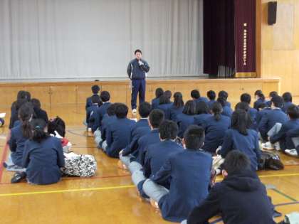 昼食終了後、各学級で短学活をしました。その後、明日からの私学入試に向けて、受験者は体育館に集まり、諸注意を受けました。