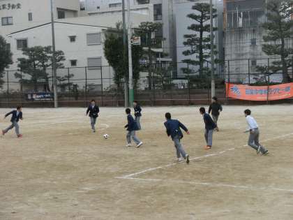 グランドで楽しくサッカーをしています。