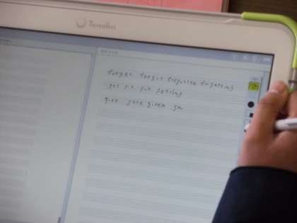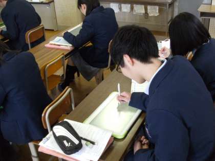 生徒一人一人に配布されたタブレット端末を用いて、先生の指示で実際に書き込んでいました。みんな集中して取り組んでいました。