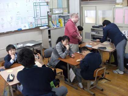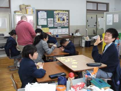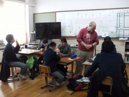 1組は英語です。ALTのエヴァン先生といっしょの授業です。