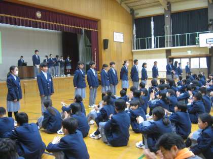 今日の6時間目は全校集会で、表彰と委員会の認証式が行われました。また、生徒会役員からみんなに向けてのメッセージ、先生からみんなへのメッセージがあり、みんなは真剣に聴いていました。みんなですてきな嘉楽中学校をつくっていきましょう。