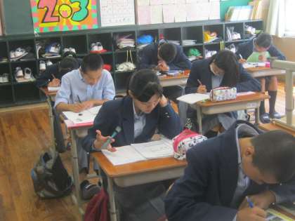 本日、2年生の土曜自主学習会では学年の3分の2以上が参加する盛況ぶりでした。テストがあと5日にせまる中、各自、真剣に取り組んでいました。みんなが頑張っている雰囲気なので、おのずと集中力が高まりますね。