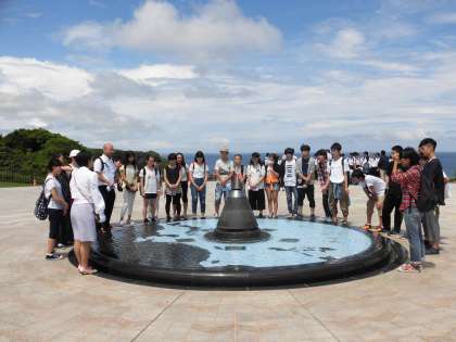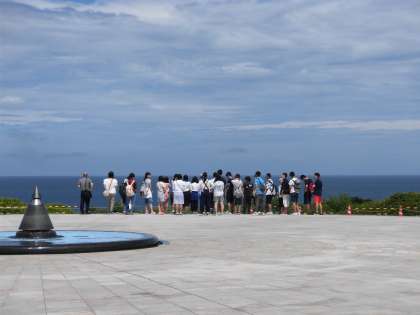 写真上:「平和祈念資料館」を背景に学級写真を撮りました。