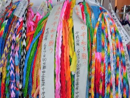 写真下:「未来永劫の平和」を願い,折鶴を献納しました。