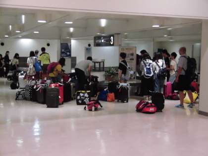 写真下:伊丹空港に着き,荷物係の生徒が確認しています。