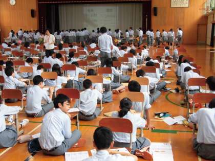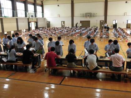 検定の順を待つ間の生徒たちは,体育館に