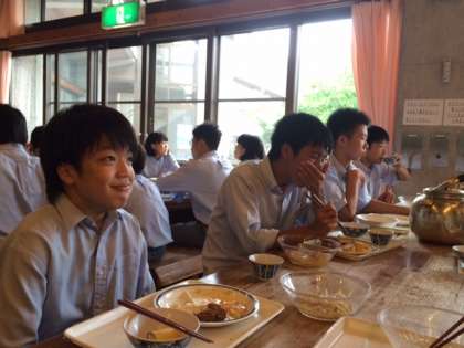 午前中の研修が終わり、昼食を食べているところです。