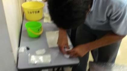 実習室で放散虫やサンゴなどの化石を双眼実体顕微鏡で観察したり、放散虫のレプリカ(実際の大きさの300倍です!)を製作したりしている様子です。