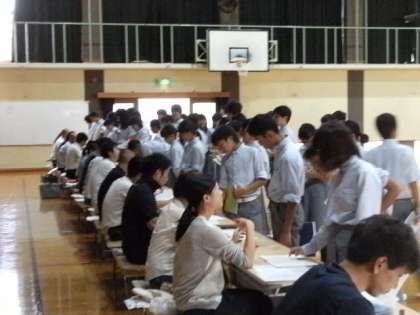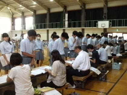 全校生徒が、指定されたノートとファイルを持って体育館に集合しました。司会・進行は生徒会のメンバーがしてくれました。そして、生徒会長の挨拶がありました。
