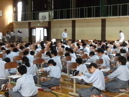 「勝負ページ」が発表されると、みんなノート・ファイルを持って検定者(先生方)のところへ行き、いよいよ検定を受けます。さあ、何級がもらえるかな?緊張の一瞬です。