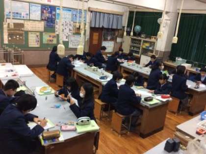 昨日の交流会の盛り上がりからか、声のかれている生徒が居る中、みんな元気にリセットして集中しています。2組は朝一番からリコーダーテスト、3組は美術の作品を、4組は光の焦点の実験をしています。