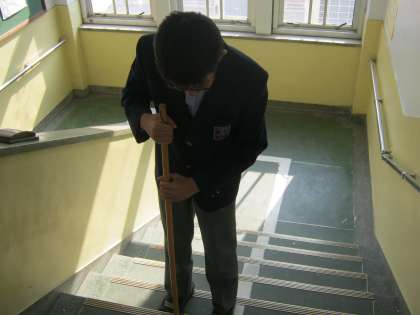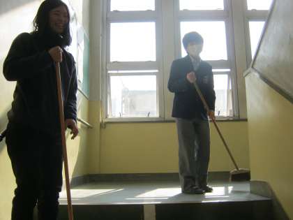 そして、階段を上がると、なんと1年生が階段を掃除していました。