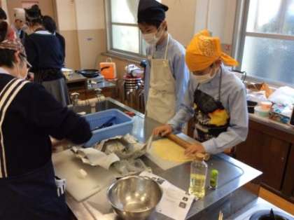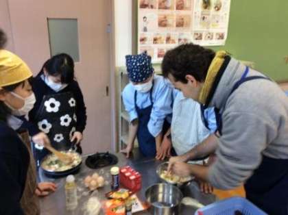 1年3組の多文化理解学習です。フランスから留学生ルークさんに来てもらい、フランスの伝統料理「キッシュ」を皆で作りました。オーブンを使っての本格的料理で、仕上がりもお店で出せるんではという出来栄えでした。美味しかった—。
