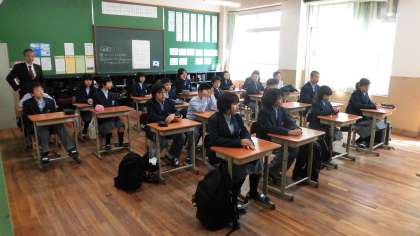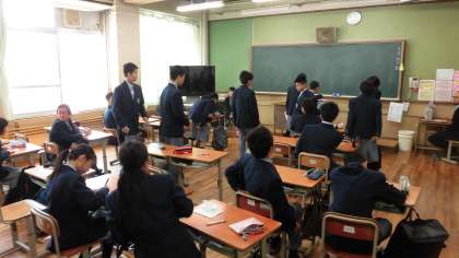 写真中:1年3組(担任の先生からのお話中)