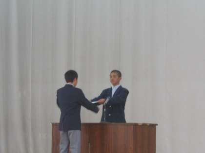 認証式で、各委員長より委員の認証が行われました。3年生が1名ずつ代表して壇上にあがり、委員長より認証書を受け取りました。クラスや学年を代表して委員会の仕事をがんばりましょう。本日第一回専門委員会が行われます。