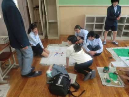 本日も午後は家庭訪問期間です。1年生も部活動を始めています。並行して取り組んでいる学級旗の製作の様子です。各クラスの学級目標を盛り込んだデザインにしています。なかなか手際よく描いているので、昨日の下書きから、今日はもうずいぶんと仕上がりが見えてきています。