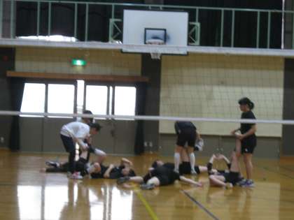 体育館ではバレーボール部とバスケットボール部が活動中です。大会に向けてがんばっています。しっかりストレッチをしています。