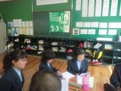 今日も、校外学習について話し合っています。もう来週は5月。楽しい校外学習が近づいてきました。バックの学級旗もご覧ください。どのクラスの旗もかっこよく輝いていますね。