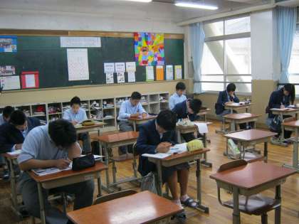 本日、テスト前の土曜学習会が行われています。あいにくの雨ですが、3年生の教室ではそれを吹き飛ばすほどの活気にあふれ、みんな集中してテスト勉強に励んでいます。
