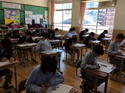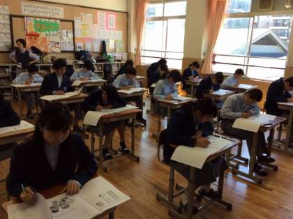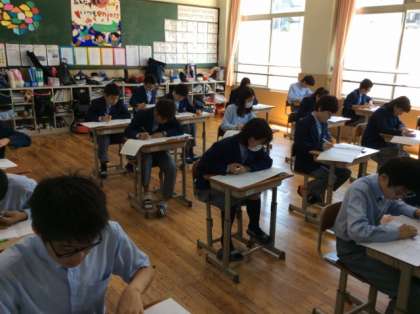2年生第1回定期テスト2日目。3限目の英語テストの様子です。ラストです、やりきりました。